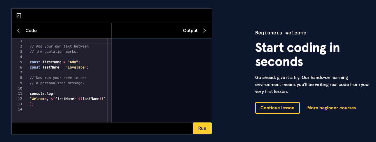 “Start coding in seconds” can definitely appeal to any parent or child spinning their wheels and wondering how to start exploring coding skill development. In goes the code, and out goes the result. It’s seemingly that simple. If you still need a nudge, Codecademy offer a quiz to help you sort through which course might be best for you and your unique circumstances.